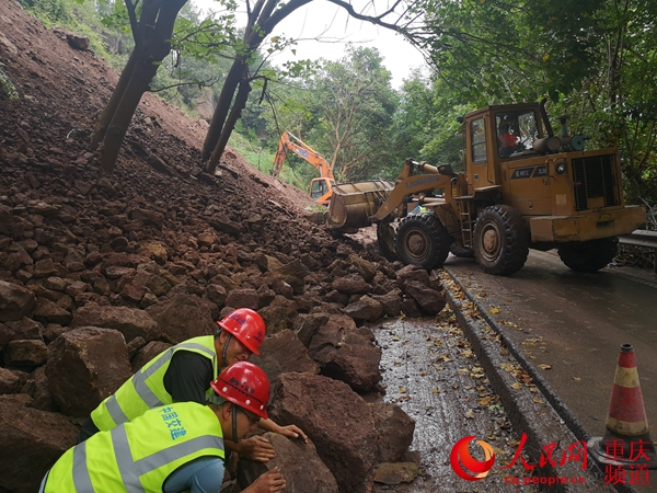 7月22日上午,雨后初晴的天氣涼風習習。在國道318線萬州境內長嶺與長灘兩個鎮鄉之間的一處塌方體前,吳興建正在操作著熟悉的裝載機,加緊搶通道路。正實行半幅通行的公路上,車流如織。項目副經理孟紅偉正帶領搶險突擊隊,在另一側山體上加緊清理前幾天被山洪沖垮、引發塌方的堆積物,并組織機械人員疏通排水溝,砌筑片石混凝土擋墻。